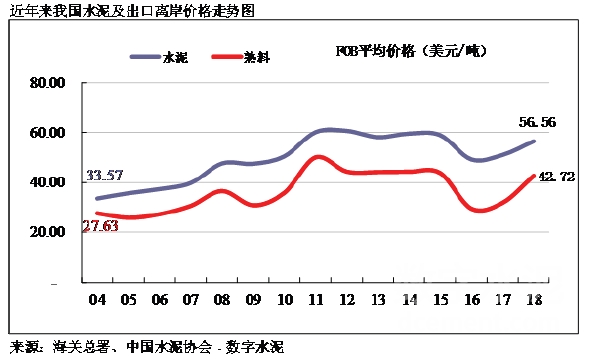 自2006年水泥出口達(dá)到高峰的3,612萬噸以后,我國水泥出口量呈明顯逐年下降趨勢,主要原因:一是我國出口政策的調(diào)整,2007年國家取消了11%出口退稅的優(yōu)惠政策。二是國際市場需求疲軟,水泥需求缺口縮小,尤其是原來我國出口大戶美國房地產(chǎn)業(yè)投資大幅下滑,導(dǎo)致其進(jìn)口水泥大幅度縮減。2018年出口量僅為904萬噸,這是自2005年以來首次跌破1000萬噸,但出口的FOB價格連續(xù)三年回升,2018年達(dá)到56.6美金。